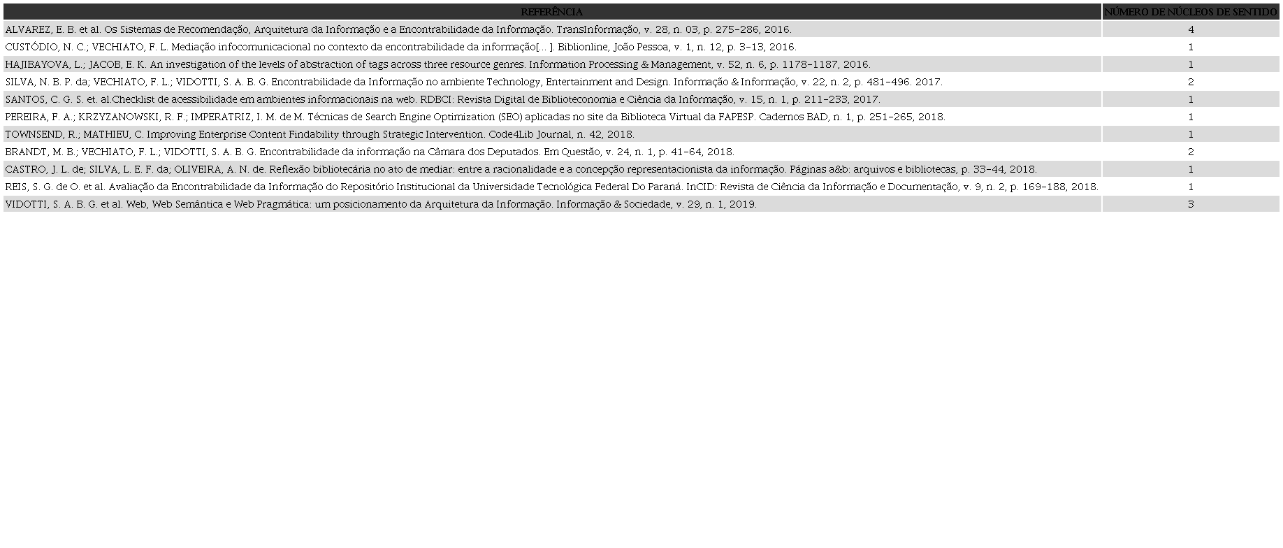 Empregamos a técnica de análise de conteúdo temática constatando “[...] os ‘núcleos de sentido’ que compõem a comunicação e cuja presença ou frequência de aparição podem significar alguma coisa para o objetivo analítico estudado” (BARDIN, 2011, p. 135). Percorremos o conteúdo de todos os artigos, segundo a fundamentação metodológica da Análise de Conteúdo, para selecionar aqueles que possuem fragmentos textuais ou núcleos de sentido que relacionam a Encontrabilidade da Informação e a Arquitetura da Informação.