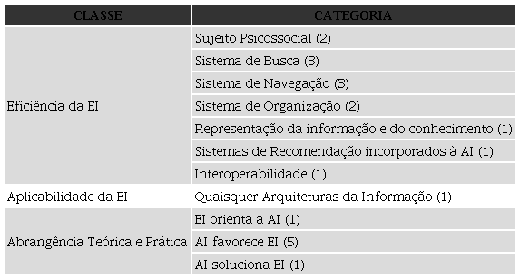 Procuramos identificar em cada fragmento textual o tipo de relação apresentada entre a Encontrabilidade da Informação e a Arquitetura da Informação gerando as classes subsequentes. Em seguida, fizemos uma redução temática analítica até chegar às categorias que estruturam cada classe, conforme apresentamos no Quadro 4. Os números expressos entre parênteses sinalizam a frequência de aparecimento da categoria no corpus dos artigos analisados.