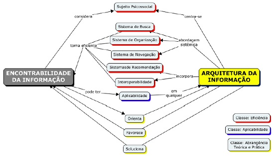 Os autores entendem a Arquitetura da Informação como epistemologia e construto teórico para a Encontrabilidade da Informação. Araújo e Valentim (2019) designam que a interação humano-máquina (sujeito-sistema de informação), relacionada com a ergonomia, usabilidade e inteligência artificial são temáticas para a representação da informação, tendo a Encontrabilidade da Informação como proposta inovadora nesses estudos.