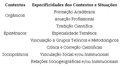 Nessa perspectiva, a concepção sociocultural considera todas essas conformações de ideias, isoladas ou em conjunto, vislumbrando a articulação de interesses, valores e crenças que determinam as práticas e representações sociais e culturais e lançam as bases da reprodução social na ciência (THOMPSON, 1995; BOURDIEU; PASSERON, 2012; BOURDIEU, 2013). Para evidenciar as possibilidades dos contextos da concepção sociocultural que incidem nas práticas de citação, traz-se o Quadro 1.