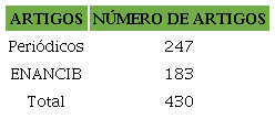 O corpus da pesquisa é formado pelos artigos de periódicos indexados pela Base de Dados de Periódicos em Ciência da Informação - BRAPCI e os trabalhos publicados nos anais do Encontro Nacional de Pesquisa em Ciência da Informação - ENANCIB de 2015 a 2018 nas categorias de comunicação oral e pôster. A Tabela 1 expressa a quantificação dos artigos que compõem o corpus desta pesquisa.