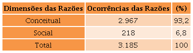 Considerando as classificações listadas no Quadro 2, a Tabela 2 expõe a distribuição das 3.185 razões por dimensão, encontradas nos 333 artigos (dos 430 artigos que compõem o corpus da pesquisa) que foram selecionados por conterem alguma citação aos autores representados no Gráfico 3.