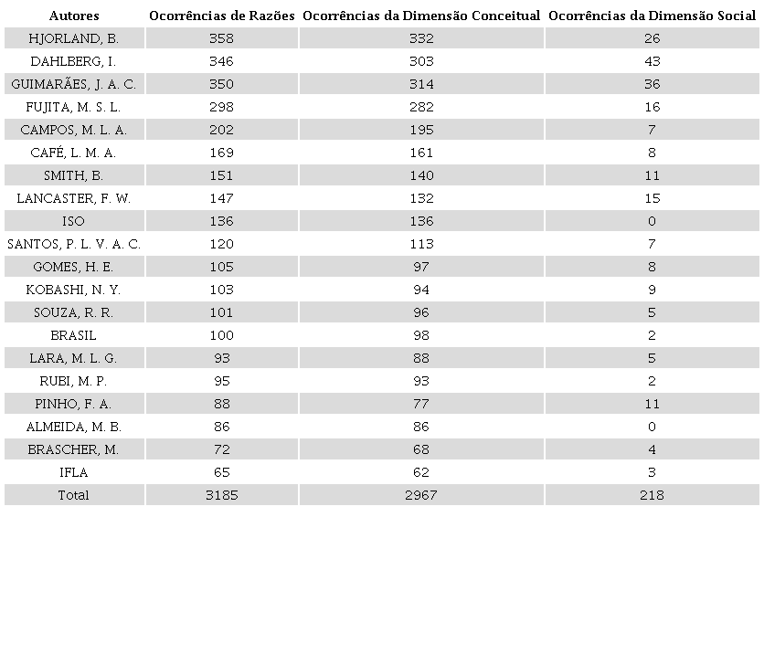 Sobre esta última dimensão, a social, cabe destacar os autores que receberam menções: HJORLAND, B. (26); DAHLBERG, I. (43); GUIMARÃES, J. A. C. (36); FUJITA, M. S. L. (16); LANCASTER, F. W. (15); SMITH, B. (11); PINHO, F. A. (11) e KOBASHI, N. Y. (9).