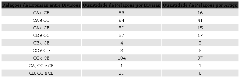 A extensão mais abrangente refere-se às razões direcionadas para fins de sustentação, exemplificação e atualização de ideias, conceitos e teorias, expressa pela relação entre as divisões CC e CE, com 104 ocorrências. Destaque ainda para a extensão composta pelas divisões CA e CC, com 84 ocorrências; as razões ligadas a essa extensão são direcionadas à apresentação de definições/conceituações, explicações de cunho teórico e sustentação de declarações e informações, muito utilizadas para explicar e enfatizar declarações ou opiniões com a finalidade de convencimento de um ponto de vista.