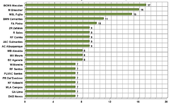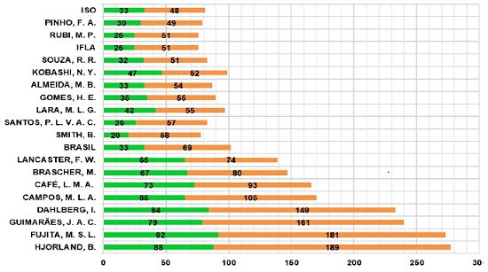 Em comparação com o resultado da pesquisa de Silveira (2016), a maioria dos pesquisadores que formavam o grupo de elite dos mais citados permaneceu, com poucas alterações, apenas cinco autores não apareceram na Tabela 3. Ocupam posições de destaque os autores: SANTOS, P. L. V. A. C.; SOUZA, R. R.; PINHO, F. A. e BRASCHER, M.