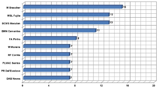 Com relação aos colaboradores dos artigos no domínio pesquisado, o Gráfico 2 exibe os 10 autores com mais contribuições, de um total de 291 colaboradores distribuídos entre os 430 artigos analisados. Ênfase para as autoras Marisa Brascher, que aparece como colaboradora em 15 artigos, Mariangela Spotti Lopes Fujita e Benildes Coura Moreira dos Santos Maculan, ambas colaboradoras em 13 artigos, e Brigida Maria Nogueira Cervantes, colaboradora em 11 artigos. Neste caso, pode-se constatar que essas mesmas autoras também figuram entre as mais produtivas no ranking apresentado no Gráfico 1, evidenciando que as posições alcançadas podem ser resultado, dentre outros fatores, das relações de colaboração estabelecidas por atividades de orientação de mestrado e doutorado e/ou de parceria em projetos desenvolvidos por estas pesquisadoras.