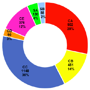 Fonte: Dados da Pesquisa (2019).Pela distribuição visualizada no Gráfico 4, as divisões ligadas à dimensão conceitual foram as que mais receberam contribuição. As ocorrências voltadas para a sustentação de declarações, exemplos, opiniões e informações (CC) aparecem com 36% (1.148), das 3.185 razões levantadas pela pesquisa. As razões voltadas para o cunho teórico-conceitual (CA) apresentam-se com 28% do total ou, mais precisamente, 902 razões vinculadas a esta divisão.