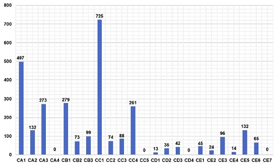 A categoria CE tem a divisão CE5 como a mais representada, com 132 ocorrências, e o objetivo é de difundir trabalhos de pesquisas anteriores que sejam importantes para as discussões e reflexões levantadas na pesquisa. A divisão CE3, que foca nos esclarecimentos de ideias, conceitos e teorias relevantes para o trabalho, obteve 96 ocorrências; já a divisão CE6 aparece em terceiro lugar nesta categoria, com 65 ocorrências acerca das vinculações entre as pesquisas e como elas se relacionam. Na divisão CE1, 45 ocorrências agrupam as razões vinculadas às bibliografias e conceitos pouco conhecidos na área. Ressalta-se ainda a divisão CE2, com 24 ocorrências ligadas a destaques bibliográficos no âmbito metodológico em literatura pouco conhecida. Por último, tem-se a divisão CE4, com quatro ocorrências ligadas às razões identificadas pelo uso de equipamentos de coleta e tratamento de dados.