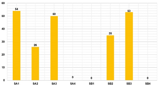 Para a categoria SB, apenas duas divisões acumularam motivos. A ênfase fica com a divisão SB3, com 53 ocorrências, que uniu o grupo de razões vinculadas às contraposições de posturas e posições, tanto sociais quanto culturais, ligadas ao domínio. E, por último a categoria SB2, associada às razões que tratam da originalidade das ideias ou alegações relacionadas a fins éticos da pesquisa, com 35 ocorrências.