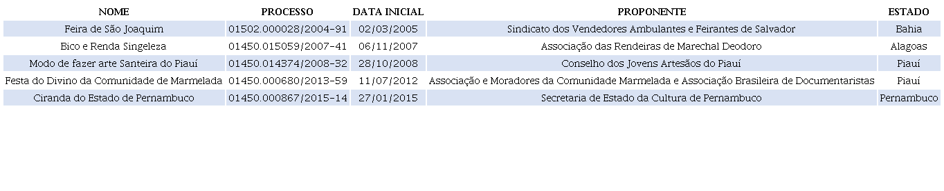 Atualmente, existem 27 bens imateriais no Brasil que, desde 2005, estão em fase de processo1, carecendo de uma pesquisa que reconheça a representatividade desses bens que estão há um bom tempo aguardando o parecer final para se tornarem Patrimônio Cultural do Brasil.