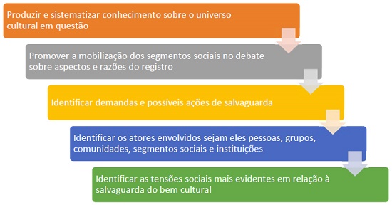 Os objetivos centrais do instrumento jurídico de proteção do patrimônio imaterial é reconhecer e valorizar o bem cultural, atribuindo valor e legitimando dentro do repertório cultural nacional. O pilar do registro é o respeito a mutabilidade e a dinamicidade do bem. Corá (2014) enfatiza que mesmo havendo uma recognição do papel da comunidade, um desdobramento de outras figuras que detenham do conhecimento do bem é crucial, antes de iniciar o processo de registro.