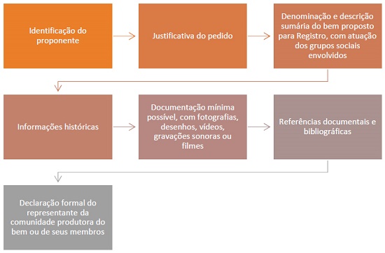 A tramitação do processo de registro está elencada em dois instantes, com o requerimento e a instrução técnica do processo administrativo. O desdobramento da solicitação do bem imaterial, requer de muitas ações que tenham um conjunto de documentos bem fundamentados para que o processo encaminhe de maneira eficaz para a instrução do processo administrativo. De acordo com o art. 4 da Resolução nº 01/2006 (IPHAN, 2006), a Figura 2 exemplifica oito documentos importantes para o envio do requerimento: