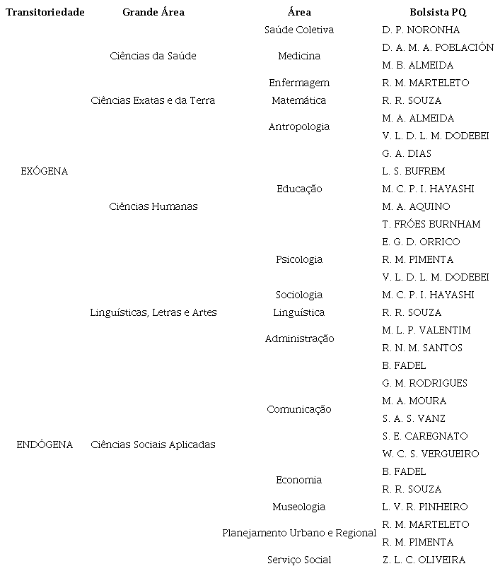Classificou-se como transitoriedade exógena a presença e potencial movimentação de pesquisadores PQ das Ciências Sociais Aplicadas/Ciência da Informação para outras Grandes Áreas do Conhecimento e como endógena a presença e potencial movimentação de pesquisadores PQ dentro da própria Grande Área das Ciências Sociais Aplicadas, contudo em diferentes Áreas. As movimentações de transitoriedade exógenas são marcadas com a percepção de movimentação e presença de 14 dos 83 bolsistas PQ em Ciência da Informação nas seguintes Grandes Áreas do Conhecimento: Ciências da Saúde (Saúde Coletiva, Medicina, Enfermagem); Ciências Exatas e da Terra (Matemática); Ciências Humanas (Antropologia, Educação, Psicologia, Sociologia); Linguísticas, Letras e Artes (Linguística). Foram percebidos movimentos transitórios endógenos (Ciências Sociais Aplicadas) em 13 dos 83 bolsistas PQ nas seguintes áreas: Administração, Comunicação, Economia, Museologia, Planejamento Urbano e Regional, e Serviço Social.