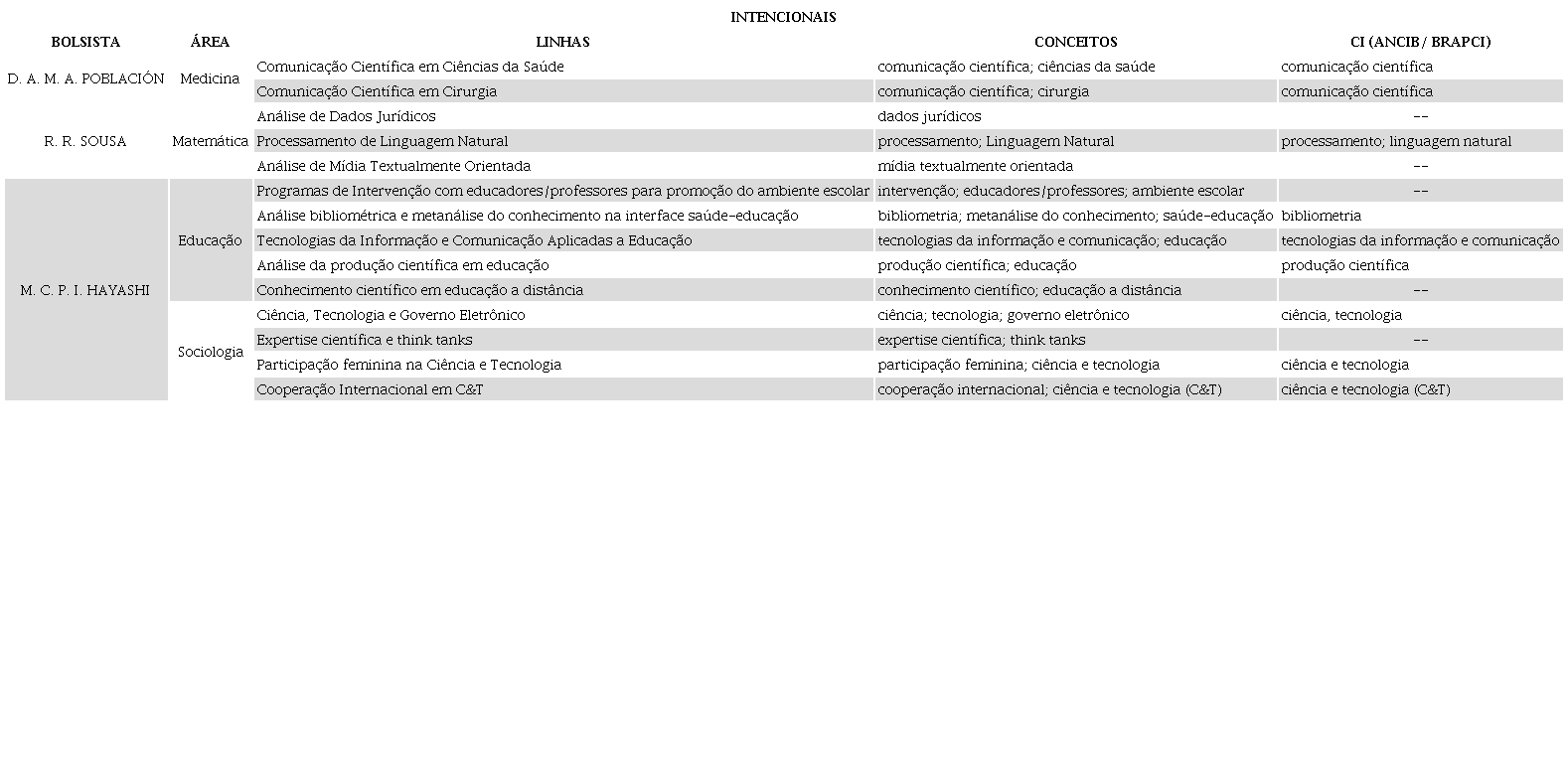 Movimentos intencionais centrífugos (liderança no grupo de pesquisa) foram percebidos nas seguintes Grandes Áreas: Ciências da Saúde - Medicina (D. A. M. A. POBLACIÓN); Ciências Exatas e da Terra - Matemática (R. R. SOUZA); Ciências Humanas - Educação e Sociologia (M. C. P. I. HAYASHI). Sendo intencional, a trajetória transitória centrífuga desses agentes PQ, percebidos no quadro 2, torna-se emergente o conhecimento dos conceitos trabalhados por eles nos distintos campos disciplinares. Incluídos nesse ritmo, os movimentos de colaboração, ou seja, não intencionais, também demandam análises conceituais reveladoras de possíveis movimentações transitórias profícuas entre campos disciplinares distintos. O quadro 3 apresenta as linhas de pesquisa de atuação dos três bolsistas PQ em CI com movimentações transitórias centrífugas intencionais. Nessas linhas, verifica-se a evocação de conceitos comuns à Ciência da Informação, estabelecendo relações transitórias. Percebe-se a Ciência da Informação em expansão para outras Grandes Áreas, devido a movimentos transitórios que podem promover receptivas trocas e contribuições. Vale notar que os grupos de pesquisa não estão registrados na Grande Área de Ciência Social Aplicada/Ciência da Informação, porém é notório nos registros conceituais presentes nas linhas de pesquisa das áreas de Ciências da Saúde, de Ciências Humanas e de Ciências Exatas e da Terra a intenção de validação de conceitos comuns à Ciência da Informação.