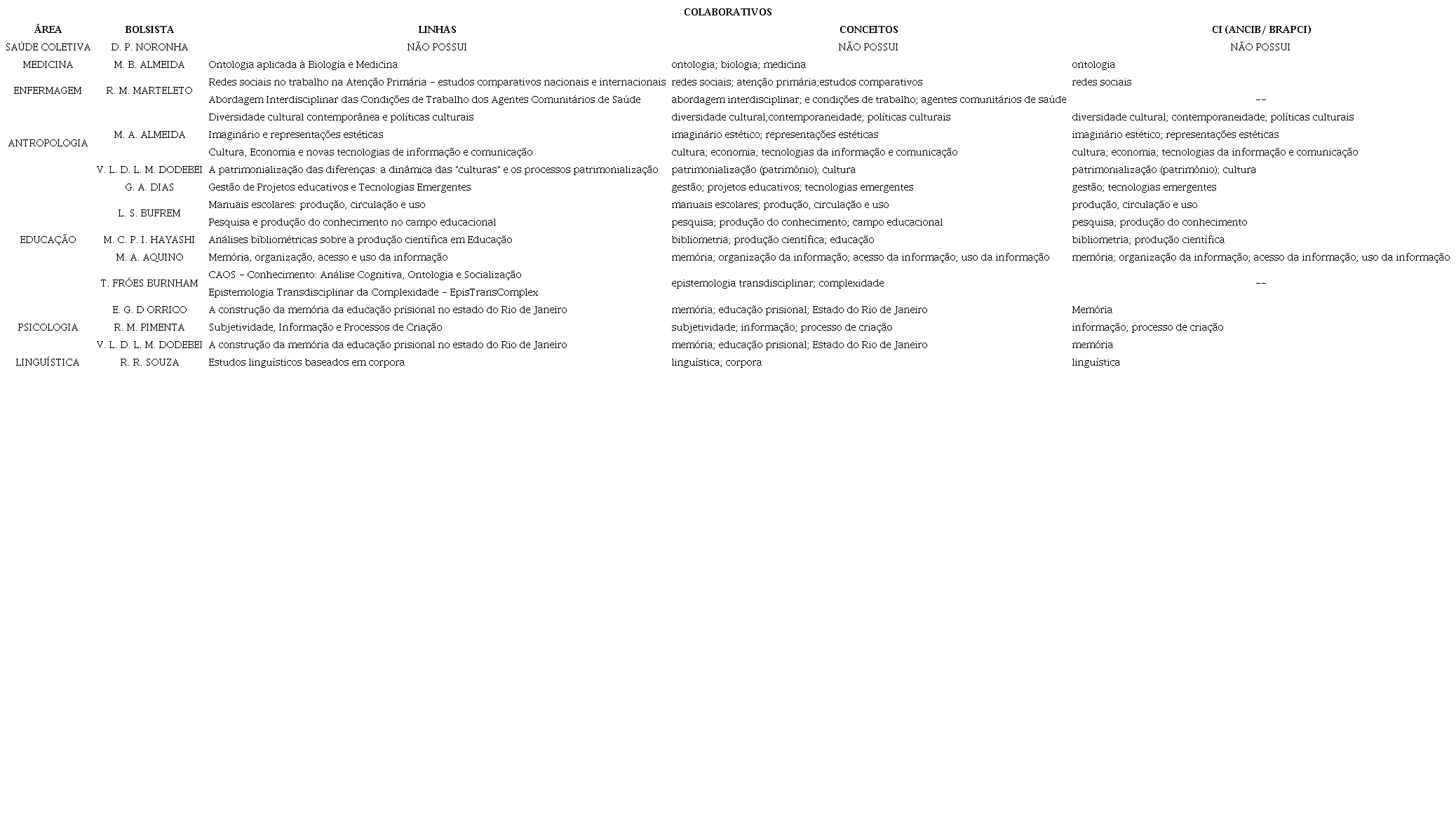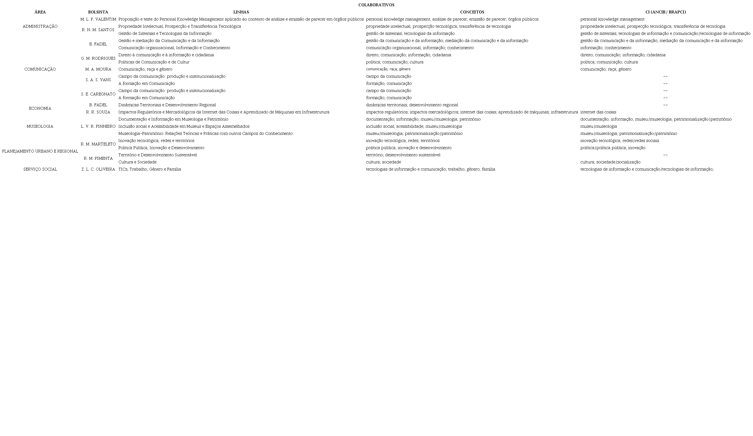 O quadro 4 demonstra as movimentações transitórias centrífugas colaborativas, apresentando as linhas de investigação dos grupos de pesquisa dos bolsistas PQ que realizaram esse tipo de ação e respectivo tratamento e análise de compatibilidade conceitual. Assim como nos movimentos centrífugos intencionais, verificam-se, nessas linhas de pesquisa, a evocação de conceitos comuns à Ciência da Informação. Configura- se, mais uma vez, a expansão de um campo disciplinar por meio de ações de agentes específicos. Relações interdominiais mostram-se possíveis entre áreas, podendo-se inclusive indagar questões de pertencimento, como, por exemplo, o conceito de “linguística”, legítimo aos estudos da área de Linguística, mas, também fundamental aos estudos da Ciência da Informação. Com isso, é possível perceber influências da CI para outras áreas como também a emergência conceitual de outras áreas em relação à Ciência da Informação.