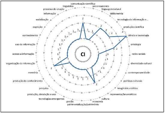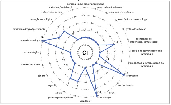 Analisando os conceitos de maior incidência (≥2) nesse gráfico, percebeu-se uma variedade representativa, não ocorrendo um indicativo de reconhecimento referente a presença de determinado campo de estudo, como foi o caso dos estudos métricos nas movimentações transitórias centrífugas. É verificado, portanto, além da multiplicidade, o diálogo de conceitos comuns entre a CI e as áreas levantadas.