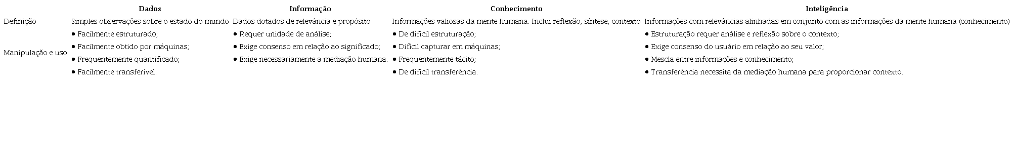 Seguindo nesse raciocínio, o conhecimento pode ser definido como algo que reside na mente humana, construído na relação do indivíduo com o mundo, ou seja, toda sua vivência, experiência e demais aspectos gerados ao longo da vida. A inteligência atua na relação entre as informações e conhecimentos, sendo estas utilizadas para tomadas de decisões (DAVENPORT; PRUSAK, 1998; PÉREZ-MONTORO-GUTIÉRREZ, 2000; VALENTIM, 2002, JORGE, 2017). No quadro 1 estão sistematizados os conceitos de dados, informação, conhecimento e inteligência, tratados até aqui.