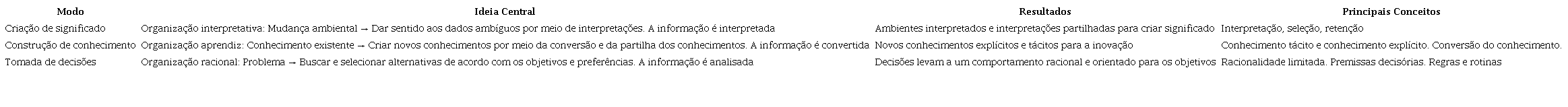 Choo (2003) menciona no quadro 2 que as informações no contexto das organizações possuem três modos de uso: (1) a criação de significado; (2) a construção de conhecimento; e (3) as tomadas de decisões. Nesse sentido, observa-se que a informação pode atuar desde a interpretação das informações, no processo de construção de significado, perpassando como insumo para construção de novos conhecimentos, até ser utilizada como recurso para tomadas de decisões.