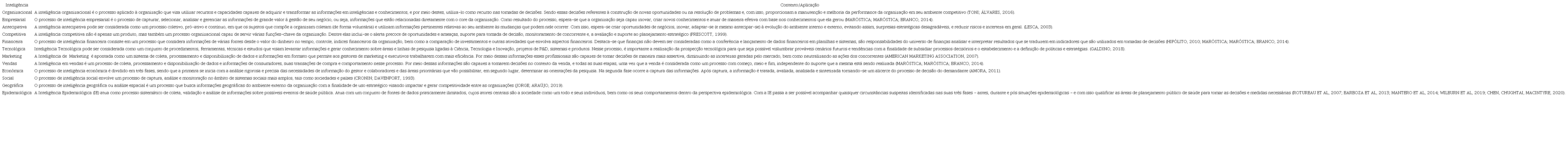 Partindo dessa ideia, deve-se compreender o contexto da inteligência, de acordo com a sua conjuntura e aplicação. Dentre as inúmeras aplicações, destacamos as inteligências: Organizacional, Empresarial, Antecipativa, Competitiva, Financeira, Tecnológica, Marketing, em Vendas, Econômica, Social, Geográfica (Análise Espacial) e, Epidemiológica. O quadro 3 visa proporcionar destaque para o contexto e/ou aplicação das inteligências mencionadas: