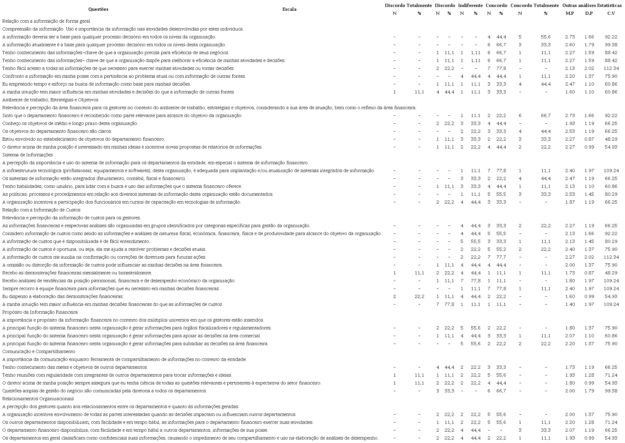 O propósito da informação financeira recebeu análise estatística, de modo a analisar importantes perspectivas. Todas as afirmações obtiveram M.P igual ou superior a M.A, ou seja, entre 1.80 e 2.20. Entretanto, os desvios padrões chamou a atenção, pois todas as afirmações apresentaram distanciamento nas respostas. A dispersão foi comportamento apresentado no C.V, sendo que as afirmações ficaram entre 60.8 e 75.90. É possível compreender que a dispersão das concordâncias consiste na relação de cada área e percepção do sistema financeiro como provedor informacional para múltiplas áreas da organização.