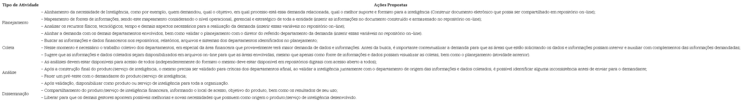 Dessa forma, foi construída uma proposta com parâmetros aplicáveis para a ACIM dentro do modelo de atividades básicas de inteligência proposto por Jorge (2017). Com isso, construiu-se um modelo de inteligência financeira organizacional para a entidade, conforme pode ser visualizado no quadro 4.