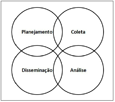 À vista disso, ao abordar a inteligência enquanto processo, Jorge (2017) avaliou e construiu um modelo que aborda atividades básicas de um processo de Inteligência. Nesse sentido, o autor avaliou os modelos conceituais desenvolvidos por Porter (1980), Fleisher (2001), Prescott (1999), Miller (2001), Bouthillier e Scherer (2003), Más-Basnuevo (2005) e Lesca (2003) e delimitou as atividades básicas de inteligência, independe de seu contexto, conforme pode ser visualizado na figura 1.