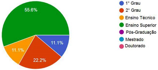No contexto da escolaridade é possível observar que apenas um (1) sujeito tem o 1° grau completo. Dois gestores possuem o segundo grau completo, representando 22,2% dos entrevistados. Apenas (1) sujeito possui curso técnico, enquanto três (3) sujeitos, representando 55,6% do total dos pesquisados possuem ensino superior completo. Dessa forma, é possível inferir que, assim como a idade, o grau de escolaridade é um importante aspecto dos gestores que trabalham com a informação.