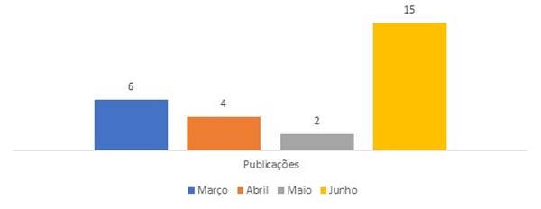 As publicações acerca desta problemática apresentam um crescimento exponencial no mês de junho, quarto mês após a publicação dos primeiros decretos. Não houve, entretanto, a veiculação de uma campanha voltada ao combate, conscientização, prevenção ou de suporte contra as violências de gênero que, seguindo os pressupostos, apresentariam um grande aumento.