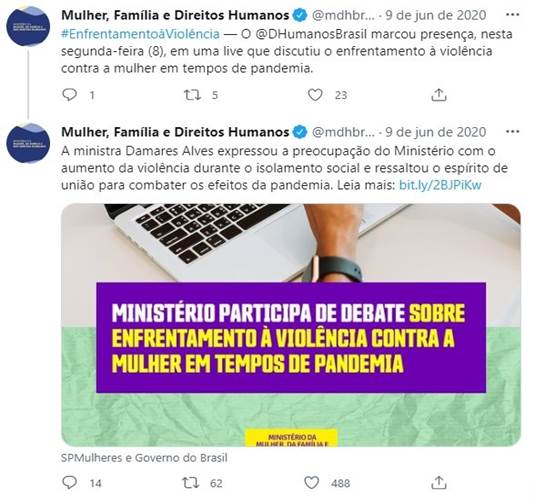 A publicação no perfil de Tweet com maior engajamento em número de likes e retweets ocorreu em 9 de junho, referente à realização de uma transmissão ao vivo, popularmente conhecida como live, onde foram debatidos os enfrentamentos à violência contra a mulher. O Tweet (Imagem 1) veicula um breve resumo do acontecido e um link para acesso à notícia no portal do Governo Federal, o gov.br.