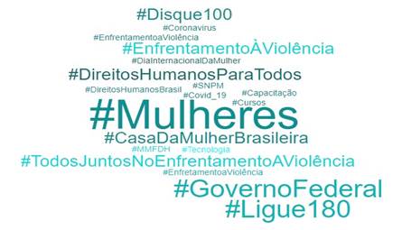 Com a análise das hashtags, é possível identificar uma generalização, quando se referem à violência. Porém, essa estratégia não é suficiente para tratar do fenômeno complexo da violência de gênero, há a necessidade de ações informativas que qualifiquem o tipo de informação, enfatizando que a violência ocorre motivada por questões de gênero. A qualificação e autorreferência ocorrem, apenas, para direcionar as ações a representantes do Ministério, ao governo ou ao próprio Ministério.