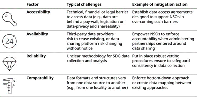 As barreiras ao acesso a dados de terceiros exigem que os governos e as ONE adotem uma abordagem pragmática e seletiva no uso de fontes de dados de terceiros. O relatório recomenda algumas ações de mitigação potenciais para obter acesso a fontes de dados de terceiros: