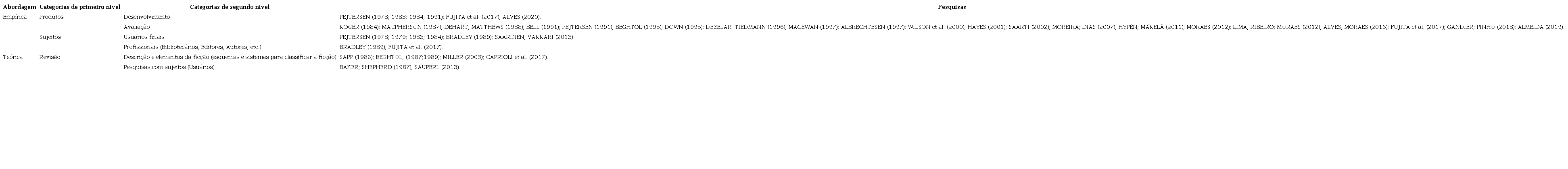A categoria revisão, relacionada à abordagem teórica, compreendeu todas as pesquisas que levantaram dados com base em outros trabalhos, realizando uma avaliação ampla referente à descrição e elementos da ficção. Também evidenciou as informações sobre esquemas e sistemas para classificar a ficção. Além disso, foram identificadas pesquisas com sujeitos discorrendo sobre as distintas opiniões evidenciadas por pesquisadores sobre a indexação da ficção.