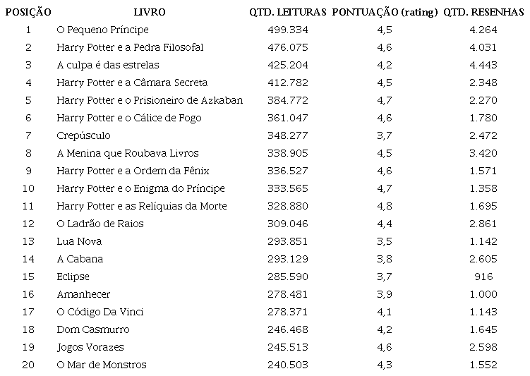 Inicialmente, na etapa de coleta de dados, foram extraídos, nos dias 8 e 9 de dezembro de 2020, textos de resenhas publicadas na plataforma Skoob. Foram selecionadas, no total, 45.114 resenhas referentes aos 20 livros mais lidos entre os usuários da plataforma. Para a extração de textos das resenhas selecionadas foi utilizada a técnica computacional chamada web scraping, construída na linguagem de programação Python. Tal técnica permite extrair informações relevantes de determinado site para posteriormente serem analisadas. A Tabela 1 apresenta o ranque dos 20 livros mais lidos, com suas respectivas avaliações e quantidade de resenhas publicadas.