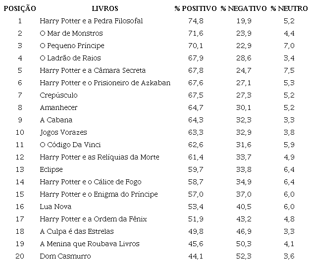 Nesta tabela é possível visualizar que o vigésimo livro (último do Top 20) mais lido pelos usuários da plataforma Skoob, intitulado ‘O mar de Monstros’, foi o segundo livro que mais recebeu sentimentos positivos nas resenhas dos leitores. Já o décimo segundo livro da lista, intitulado ‘O Ladrão de Raios’, foi o quarto livro que mais recebeu sentimentos positivos nas resenhas dos leitores. Isso poderá influenciar um usuário da plataforma que esteja indeciso por qual livro iniciar a leitura ou colocar na sua lista de próximas leituras. Provavelmente esse usuário levará em consideração, quando de sua tomada de decisão, o fato de que ambos os livros, por serem bem avaliados nas resenhas de outros usuários, possam vir a se tornar suas primeiras prioridades de leitura.