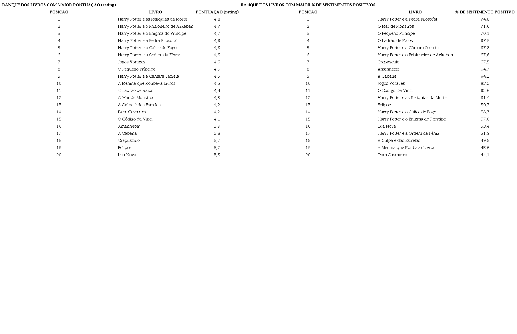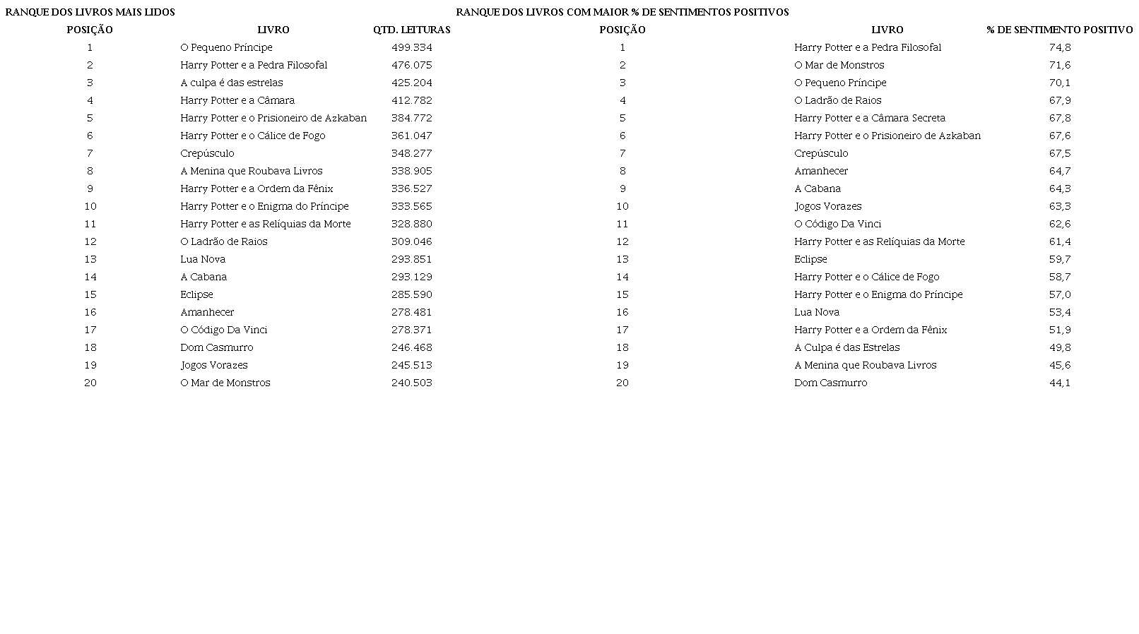 Após a execução das etapas descritas anteriormente, será analisado a seguir o ranque de sentimento positivo proposto neste trabalho devido ao fato deste apontar tendências de leitura e pelo potencial para engajar novos leitores atraídos por indicações positivas de outros leitores (NASCIMENTO; ODDONE, 2016).
