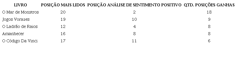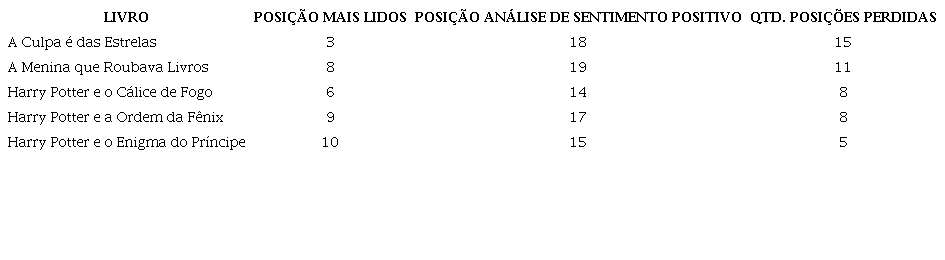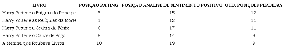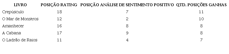 Por sua vez, a Tabela 5 mostra os cinco livros mais lidos da plataforma Skoob que mais desceram posições no ranque quando classificados pelo critério de maior percentual de sentimentos positivos.
