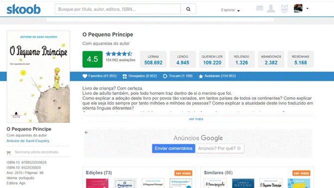 Quando é efetuada a busca por determinado livro, o usuário é direcionado para uma página onde é possível encontrar informações sobre a obra, tais como capa, nome do autor, editora, e outros dados sobre a edição e publicação. A presença de estrelas ao lado da capa do livro, têm o papel de exibir o valor médio das avaliações que todos os usuários fizeram do livro. Na Figura 1 é possível visualizar que o livro “O Pequeno Príncipe” recebeu uma média de 4,5 estrelas (de uma escala de 5 estrelas) nas avaliações dos usuários, o que significa uma pontuação (rating) alta. Além disso, exibe a informação de quantos usuários já leram, quantos estão lendo, quantos querem ler, quantos estão relendo, quantos abandonaram a leitura e quantas resenhas foram feitas sobre o livro.