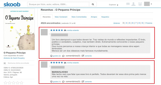 O usuário, quando logado na plataforma, é estimulado a construir vínculos com outros usuários, por meio do compartilhamento de suas opiniões e avaliações. Para isso, uma das principais fontes que a plataforma disponibiliza são as resenhas de livros, a partir das quais é que se iniciam as discussões sobre um determinado livro. Tais resenhas são interessantes de serem investigadas, uma vez que fornecem uma descrição e apresentam também as opiniões dos usuários sobre a obra. A Figura 2 apresenta exemplos de resenhas publicadas para o livro “O Pequeno Príncipe”, de autoria de Antoine Saint-Exupéry.