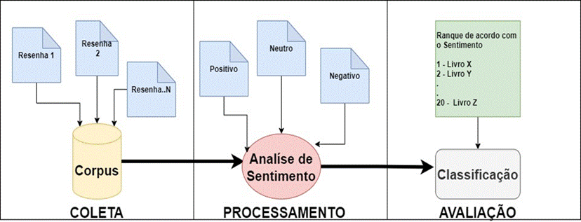 O estudo de aplicação da análise de sentimento nas resenhas de livros, proposto neste trabalho, abrange três etapas fundamentais, as quais realizam funções específicas, a saber: coleta, processamento e avaliação de textos. A Figura 3 apresenta as etapas específicas realizadas para o desenvolvimento deste artigo.