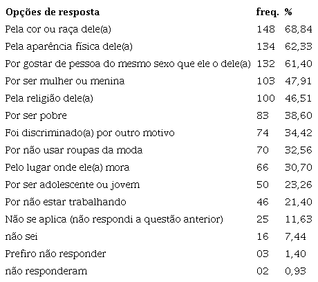 Na sequência, foi realizada uma pergunta complementar para saber o motivo pelo qual essas pessoas tinham sofrido preconceito. Os estudantes podiam escolher mais de uma opção de resposta (Tabela 1).