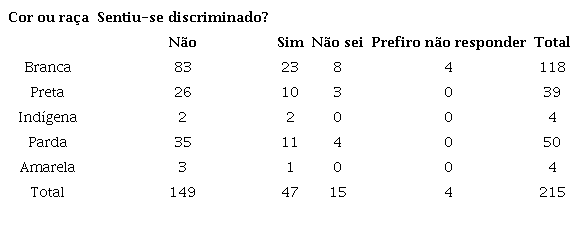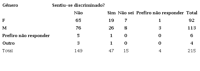 Verificou-se ainda a relação entre gênero dos participantes e o fato de se sentirem discriminados ou terem sido vítimas de preconceito (Tabela 3). A nível de 5% de significância, verificou-se que não há associação significativa entre o gênero dos respondentes e o sentimento de discriminação. Ou seja, neste caso, sentir-se discriminado não depende do gênero de cada respondente. A tabela dupla de contingência (Tabela 3) explicita tal situação na medida em que é possível observar que as proporções do sentimento de discriminação (não, sim não sei, prefiro não responder) por gênero (F, M, prefiro não responder, outro) não possuem diferenças entre si.
