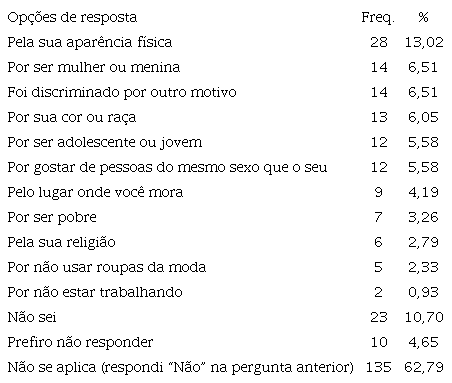 Solicitou-se, então, àqueles que haviam sofrido algum tipo de discriminação ou preconceito, que indicassem o motivo do ataque. Os estudantes poderiam assinalar quantas respostas quisessem. As respostas variaram bastante, porém, de acordo com a Tabela 4, o principal motivo foi pela aparência física, seguido por outros motivos: por ser mulher, por ser jovem e por gostar do mesmo sexo.