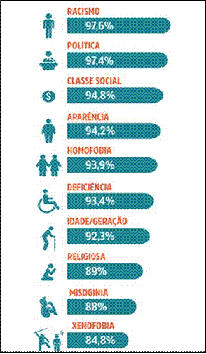 Os dez temas monitorados e seus respectivos resultados em ordem decrescente de intolerância nas redes sociais foram: racismo (97,6%), política (97,4%), classe social (94,8%), aparência (94,2%), homofobia (93,9%), deficiência (93,4%), idade/geração (92,3%), religiosa (89%), misoginia (88%) e xenofobia (84,8%). Conforme Figura 1.