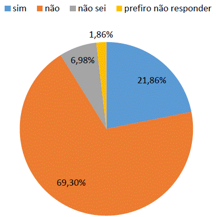 Em seguida procurou-se averiguar se o próprio estudante já tinha sofrido algum preconceito, ou já havia se sentido discriminado nos últimos 12 meses que antecederam à coleta de dados. Como se vê no Gráfico 2, a maioria (149 ou 69,30%) disse que não havia sofrido ou se sentido discriminado, mas 21,86% afirmam ter se sentido discriminado e 6,98% não saber se foi ou não discriminado e 1,86% prefere não responder, o que pode indicar insegurança do respondente em entender se comentários ou postagens lhe eram ofensivas e mesmo incômodo ou constrangimento em admitir ter sido vítima, o que elevaria ainda mais o total de respondentes vítimas de preconceito.