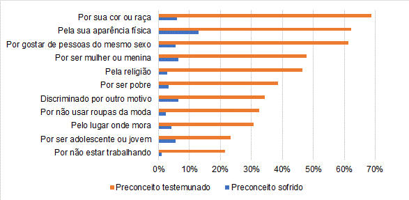 A pesquisa do Centro Regional de Estudos para o Desenvolvimento da Sociedade da Informação (CETICBR) de 2019 verificou que 43% crianças e adolescentes de 9 a 17 anos participantes do estudo afirmaram ter testemunhado alguém ser discriminado nos últimos 12 meses que antecederam a coleta de dados e 7% reportaram ter sofrido discriminação na internet. Os motivos para a discriminação testemunhada pelos participantes foram raça ou cor (53%), aparência (41%), por gostar de pessoas do mesmo sexo (30%), e por motivos religiosos (22%).