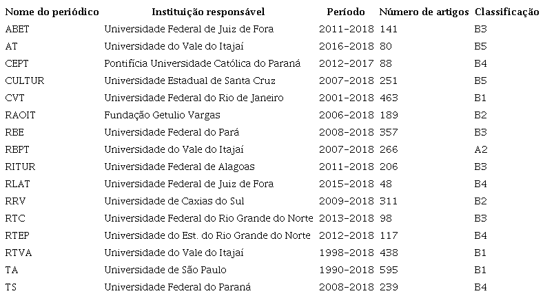 Dos cerca de 20 periódicos brasileiros que contemplam o turismo em sua linha editorial, isoladamente ou em conjunto com outras áreas, há, apenas, quatro avaliados com conceito B1 ou acima no Qualis Periódicos, Área Administração Pública e de Empresas, Ciências Contábeis e Turismo (evento de classificação: classificação de periódicos quadriênio 2013-2016), a saber: a) Revista Brasileira de Pesquisa em Turismo (RBPT) - A2; b) Caderno Virtual de Turismo (CVT) - B1; c) Revista Turismo - Visão e Ação (RTVA) - B1; e d) TA - B1.