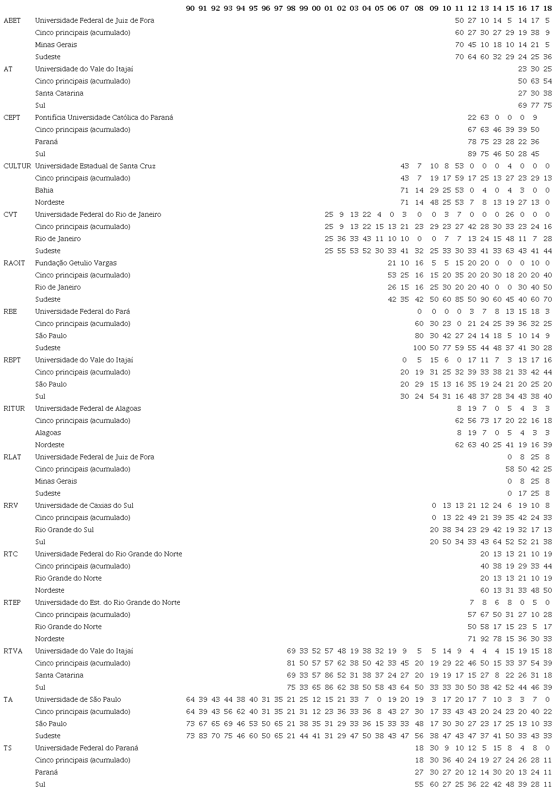 O exame do Quadro 1 revela um ponto importante acerca da concentração da produção em poucas instituições. Tomando as cinco primeiras posições para cada um dos 16 periódicos, temos a Universidade Federal do Paraná presente em dez revistas científicas, seguida pela Universidade Federal do Rio Grande do Norte (nove), Universidade de São Paulo (sete), Universidade do Vale do Itajaí (sete) e Universidade Anhembi Morumbi (seis). Todas essas instituições sediam um dos 12 programas de pós-graduação stricto sensu associados à ANPTUR; as três últimas contam com doutorado. Essa concentração é ainda mais evidente para os quatro periódicos classificados como A2 ou B1 (ver Quadro 1) - CVT, RBPT, RTVA e TA. A Universidade de São Paulo está presente nestes quatro, a Universidade do Vale do Itajaí em três e a Universidade Anhembi Morumbi em dois - a Universidade Federal do Paraná aparece, também, nesses quatro periódicos.
