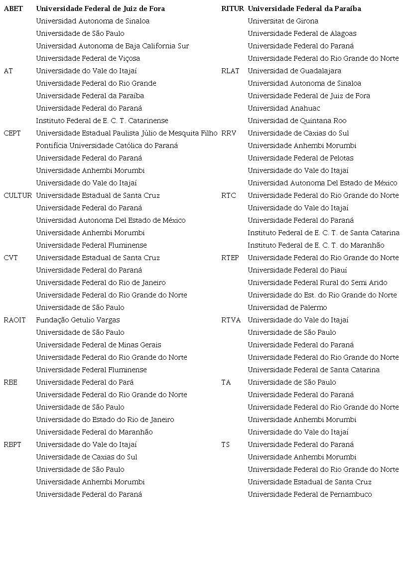 A RBE é publicada pela Sociedade Brasileira de Ecoturismo, instituição sem nenhum artigo publicado. Como proxy, foi colocada a Universidade Federal do Pará como instituição responsável pela RBE. A RBPT é publicada pela ANPTUR; trata-se, também, de uma instituição sem nenhum artigo publicado no campo. Como proxy, foi colocada a Universidade do Vale do Itajaí como instituição responsável.