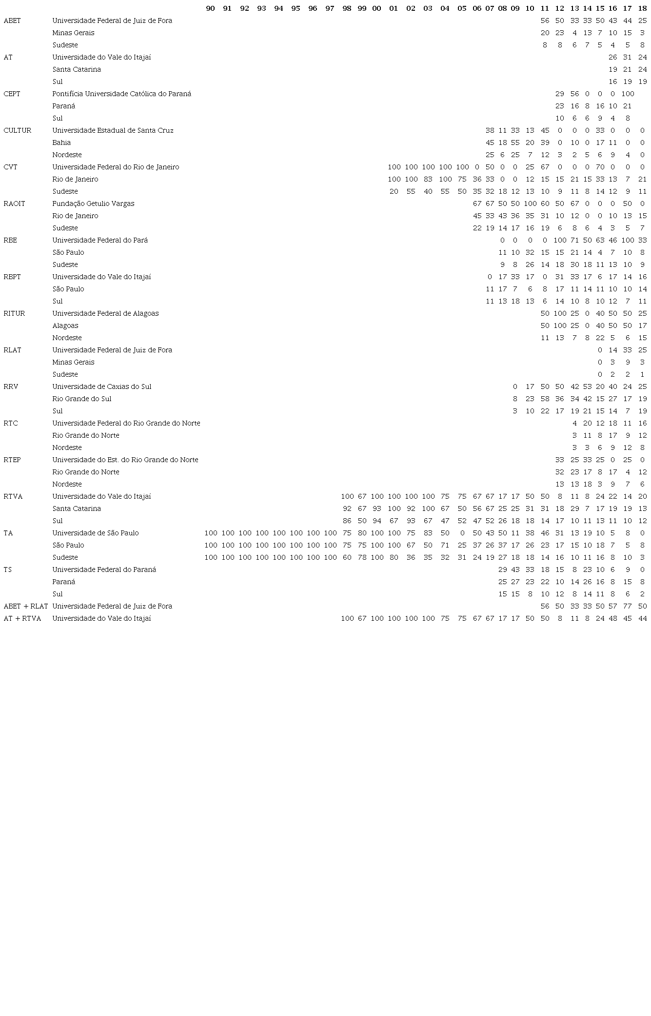 Essas duas instituições proxies foram escolhidas, por apresentarem, para cada revista científica, os mais altos valores para as fórmulas de endogenia, dependência e representação, na maioria dos anos. Foi utilizado o mesmo critério para a atribuição das unidades da federação e grandes regiões, o que resultou nas escolhas de São Paulo e Sudeste para a RBE e de São Paulo e Sul para a RBPT. Nas tabelas, esses resultados estão tachados de cinza.