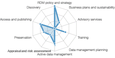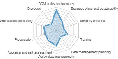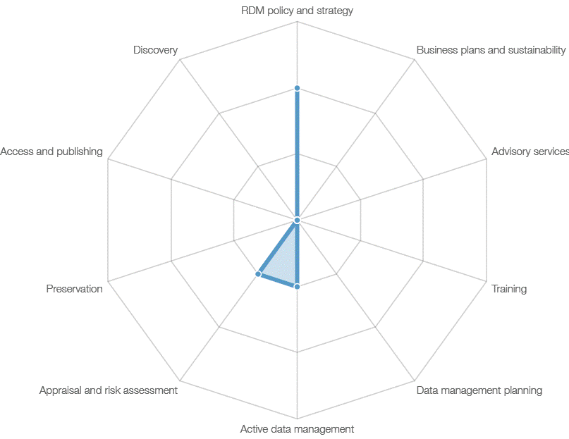 O processo de autoavaliação por meio da ferramenta RISE consiste na resposta a uma espécie de questionário (Anexo A), constituído por 10 áreas de serviço de suporte de dados de pesquisa, a saber: research data management policy and strategy/política e estratégia de gestão de dados de pesquisa, business plans and sustainability/planos de negócios e sustentabilidade, advisory services/serviços de consultoria, training/capacitação, data management planning/planejamento de gerenciamento de dados, active data management/gerenciamento ativo de dados, appraisal and risk assessment/avaliação e avaliação de risco, preservation/preservação, access and publishing/acesso e publicação, e discovery/descoberta.